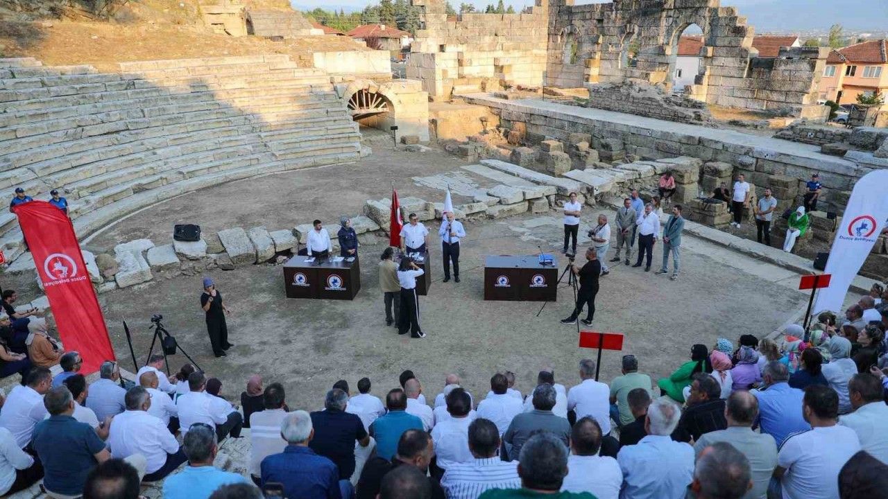Düzce Belediye Meclisi Konuralp’te tarihi yeniden canlandırdı. Kazılarının büyük bir kısmı tamamlanan ve restorasyon için gün sayan Konuralp Antik Tiyatrosu, Düzce Belediye Meclisi Ağustos ayı birinci oturumuna ev sahipliği yaptı. Tarihi bir kalabalık ile düzenlenen meclis toplantısı 27 maddeden oluşan gündeme ilişkin detayların üyelere okunması ile başladı.