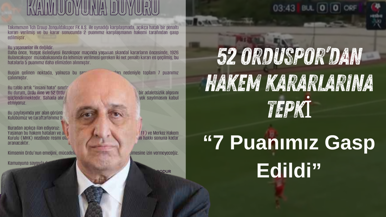 52 Orduspor Kulübü, Tch Group Zonguldakspor FK A.Ş. ile oynanan karşılaşmada verilen tartışmalı penaltı kararı ve sezon boyunca yaşanan hakem hatalarına ilişkin sert bir açıklama yaptı. Kulüp, söz konusu kararlar nedeniyle toplam 7 puanın haksız şekilde kaybedildiğini savundu.