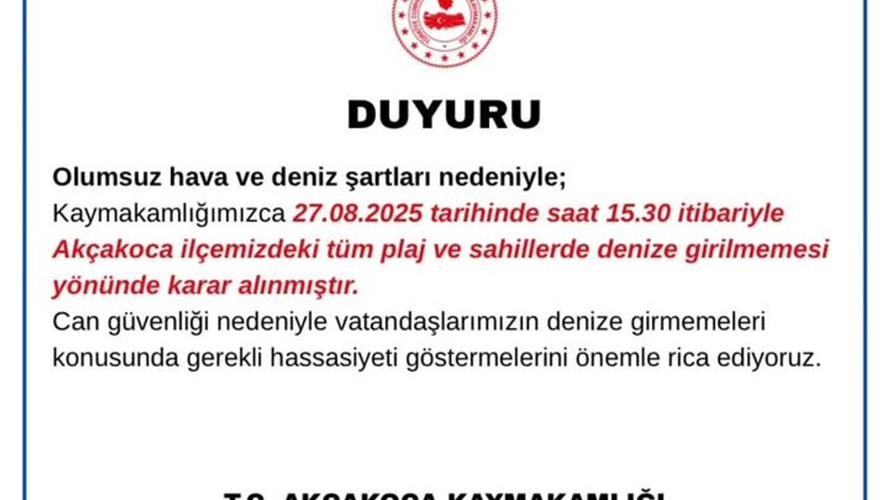 "Kaymakamlığımızca saat 10.30 itibariyle Akçakoca ilçemizdeki tüm plaj ve sahillerde denize girilmemesi yönünde karar alınmıştır. Can güvenliği nedeniyle vatandaşlarımızın denize girmemeleri konusunda gerekli hassasiyeti göstermelerini önemle rica ediyoruz."