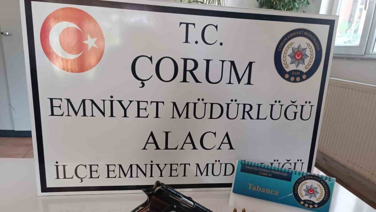 Alaca İlçe Emniyet Müdürlüğü ekipleri tarafından, ilçe genelinde huzur ve güvenliğin sağlanması amacıyla yapılan uygulamalar kapsamında durdurulan bir araçta yapılan aramada, ruhsatsız silah ve mühimmat bulundu. Ele geçirilen tabanca ve mühimmatlara el konulurken, araçta bulunan Ş.A. isimli şahıs gözaltına alındı. Gözaltına alınan şüpheli hakkında, 6136 Sayılı "Ateşli Silahlar ve Bıçaklar ile Diğer Aletler Hakkında Kanun" kapsamında adli yasal işlem başlatıldı.
