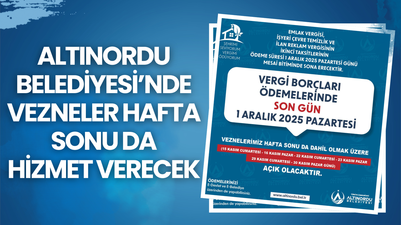 1 Aralık 2025 Pazartesi günü sona erecek Emlak, Çevre Temizlik ve İlan Reklam Vergisi 2025 Yılı İkinci Taksit Ödemeleri için Altınordu Belediyesi’nin vezneleri hafta sonu da hizmet verecek.