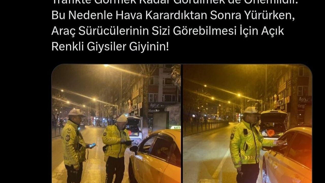 Müdürlüğün sosyal medya hesabından yapılan paylaşımda, “Trafikte görmek kadar görülmek de önemlidir. Bu nedenle hava karardıktan sonra yürürken, araç sürücülerinin sizi görebilmesi için açık renkli giysiler giyinin!” ifadeleri kullanıldı.