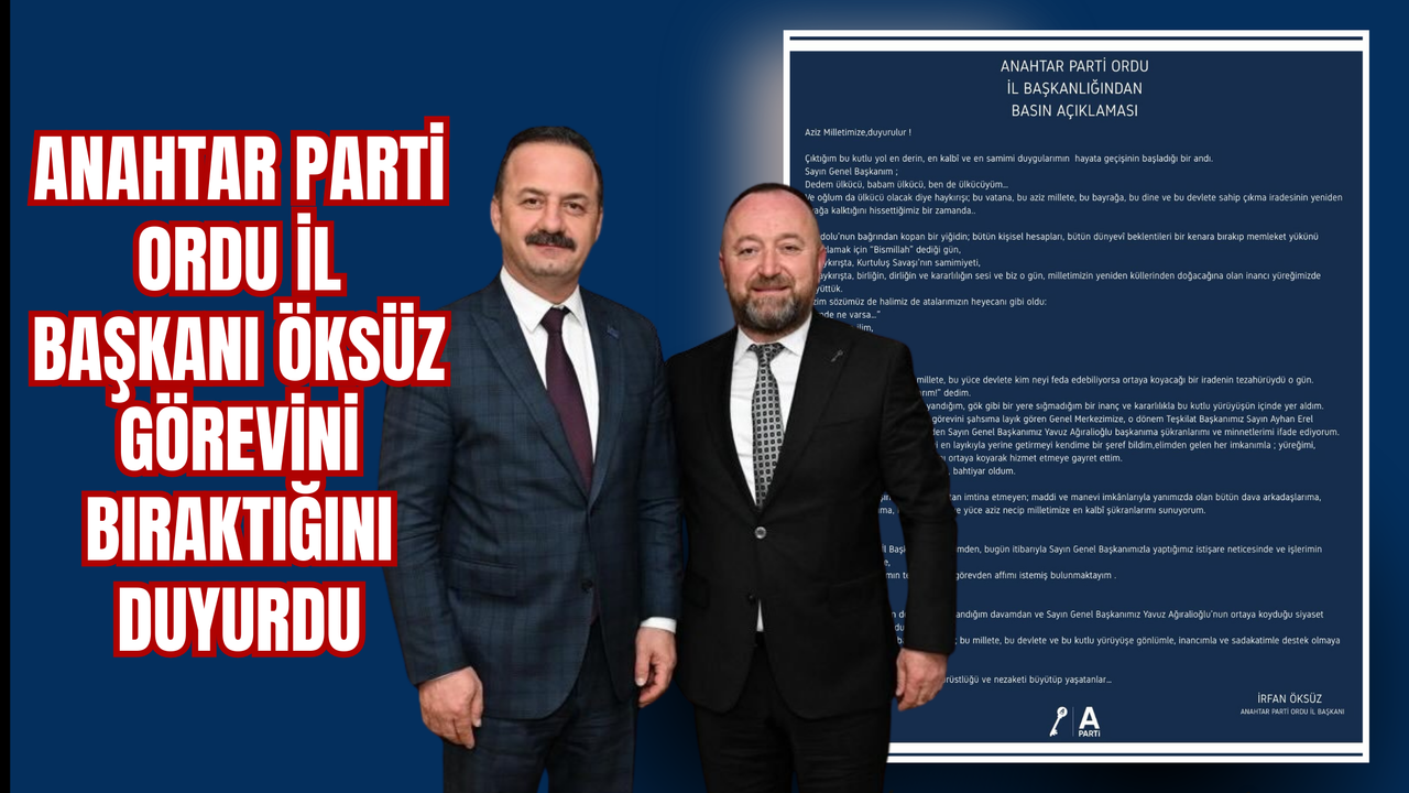 Anahtar Parti’nin Ordu İl Başkanı İrfan Öksüz görevinden istifa etti. Öksüz, yaptığı yazılı basın açıklamasında görevi Genel Başkan Yavuz Ağıralioğlu ile yapılan istişare sonucunda bıraktığını duyurdu.