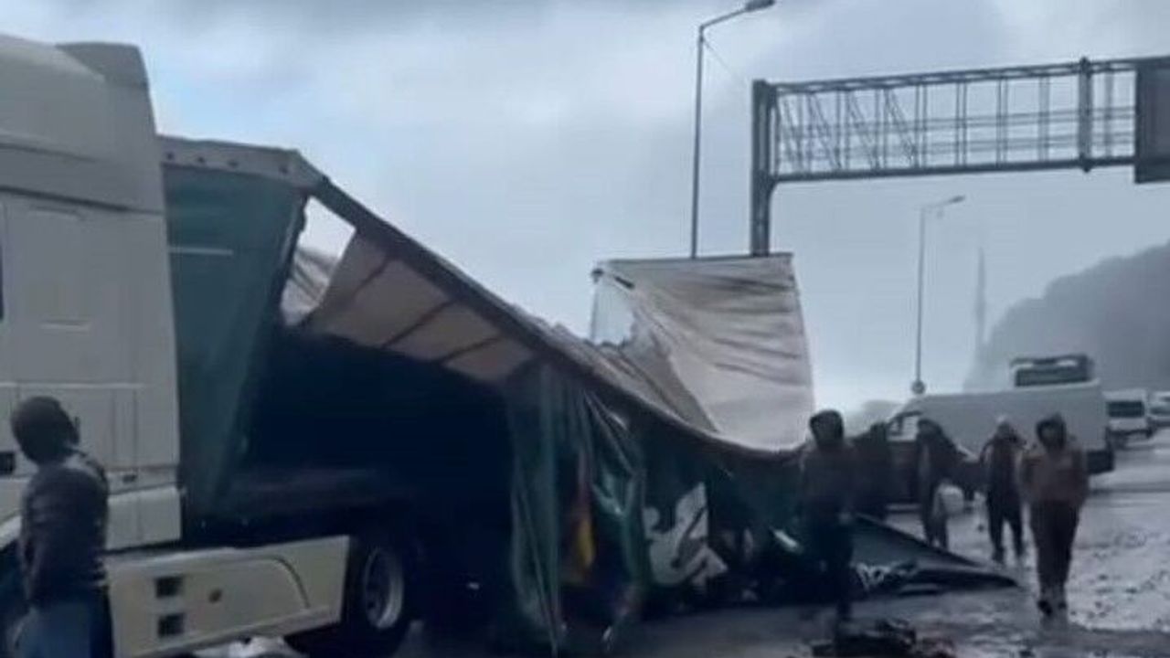 Fırtına Doğu Karadeniz Bölgesi’nde dün akşamdan bu yana etkisini sürdürüyor. Artvin’in Kemalpaşa ilçesinin Sarp Sınır Bölgesi yakınlarında sahilde park halinde bulunan bir tırın dorsesi dev dalgaların gazabına uğradı. 10 metreyi bulan duvara aşan dalgalar park halindeki tırın dorsesini parçalarken, maddi hasar oluştu.