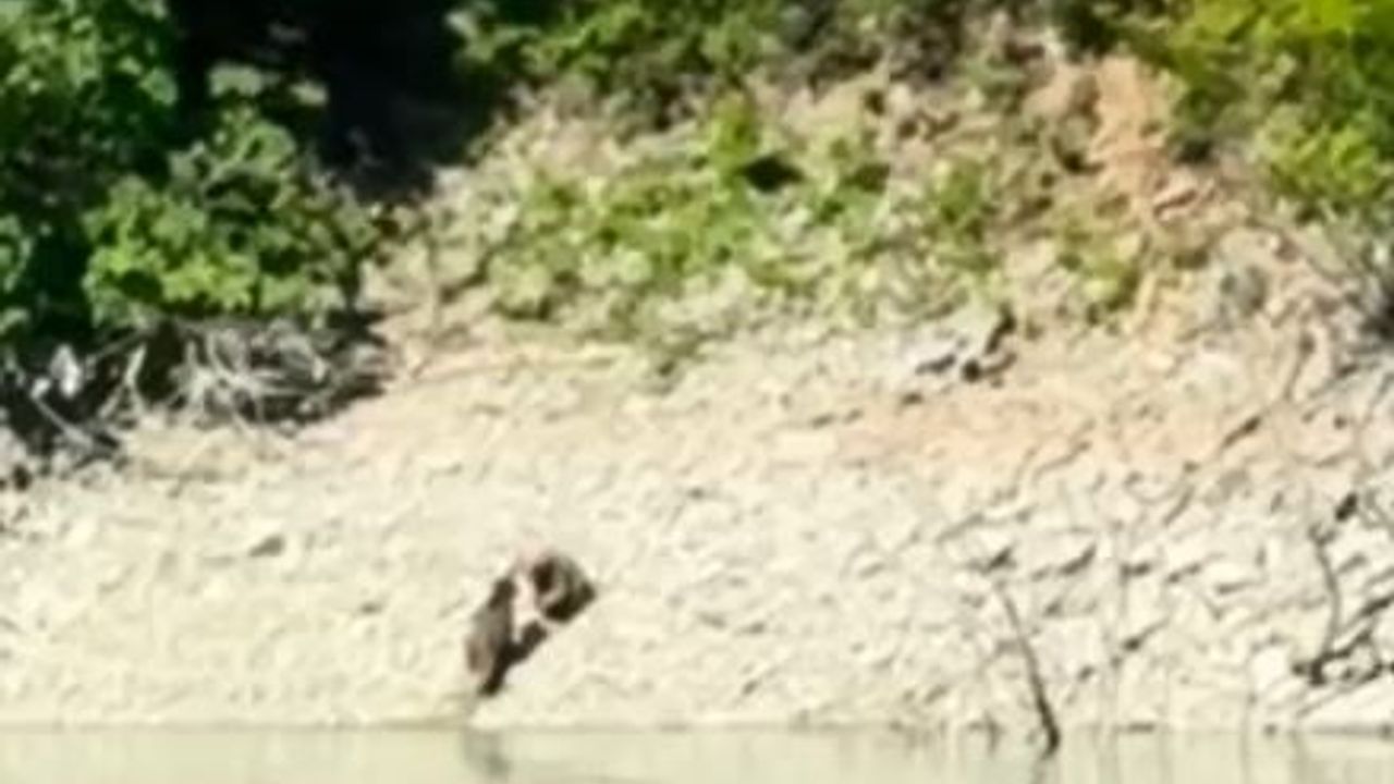 Artvin’de Çoruh Nehri kıyısında kaydedilen görüntülerde, serinlemek için suya giren iki ayının daha sonra kıyıya çıkarak kavga ettiği anlar kameralara yansıdı.