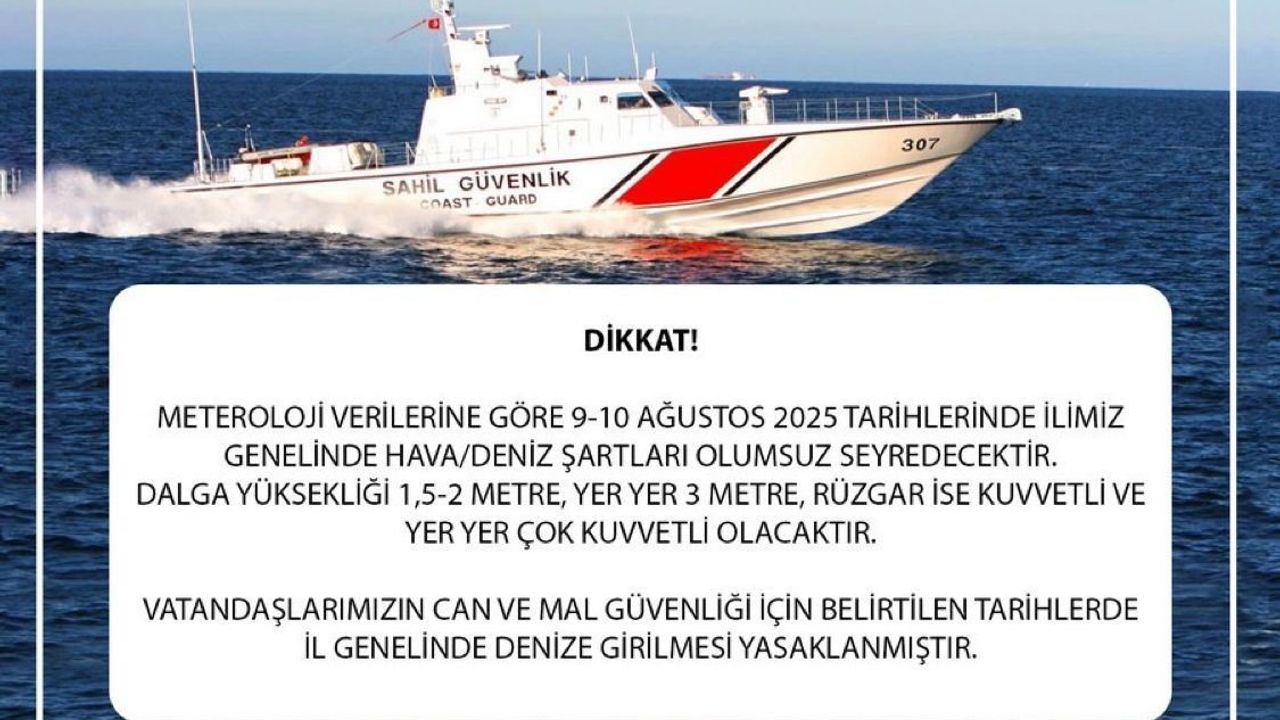 Sahil Güvenlik Komutanlığı tarafından da yapılan uyarıda, vatandaşların can ve mal güvenliği için gerekli tedbirlerin alındığı vurgulandı. Açıklamada, "9-10 Ağustos 2025 tarihlerinde ilimiz genelinde denize girilmesi yasaklanmıştır" ifadelerine yer verildi.