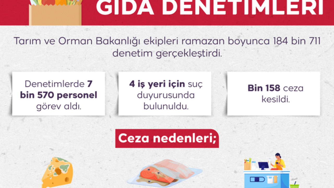 Ekipler, suç duyurusunda bulunduğu 4 iş yerine toplamda 1158 ceza kesti. Bakanlık tarafından yapılan açıklamaya göre, Gıda ve Kontrol Genel Müdürlüğü ülke genelinde denetim çalışmalarını aralıksız sürdürüyor. Ramazan ayında gıda ve yemle ilgili faaliyet gösteren üretim, satış ve tüketim yerlerine yönelik denetimler artırıldı. Denetimlerde, 81 il müdürlüğü ve bağlı ilçe müdürlüklerinde görevli 7 bin 570 kontrol personeli yer aldı. Ekipler, rutin denetim programlarına ek olarak, ramazan nedeniyle üretim, toplu tüketim ve satış yerlerine yönelik gıda denetimlerini sıklaştırdı.