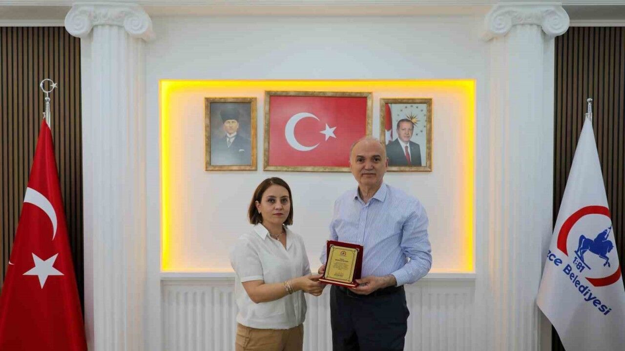 DÜZCE (İHA) – Düzce Belediye Başkanı Faruk Özlü, kurum içerisinde başarılı çalışmalar gerçekleştiren iki müdüre teşekkür plaketi takdim etti.