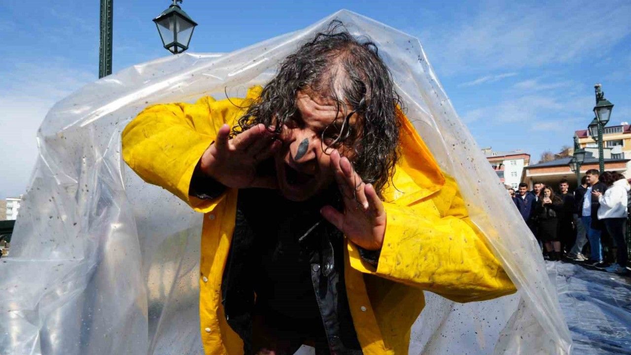 Etkinliğe ilgi gösteren öğrenciler ve vatandaşlar da performansa dahil oldu. Katılımcılar, kovalarla aldıkları suyu Kavukcu’nun üzerine dökerek eyleme destek verdi.