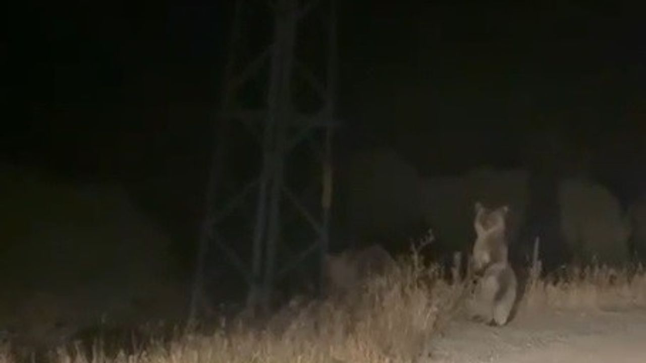 Bayburt’ta araç önüne çıkan anne ve yavru ayı, koşmaktan yorulunca durarak araçtakilere kızgın bakışlar yöneltti. Ayıların arka ayakları üzerinde dikilerek korku saldıkları o anlar, cep telefonu kamerasına yansıdı.