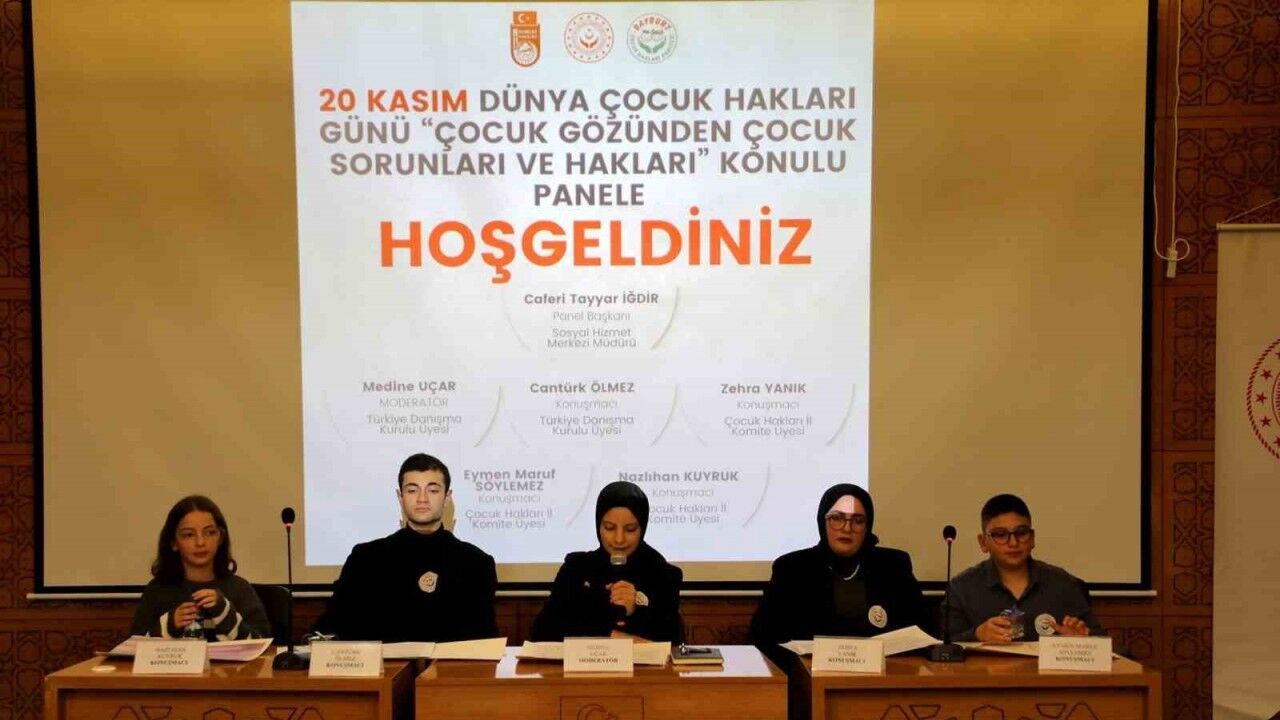 Medine Uçar’ın moderatörlüğünde Nazlıhan Kuyruk, Cantürk Ölmez, Zehra Yanık ve Eymen Maruf Söylemez’in konuşmacı olarak yer aldığı panelde, çocukların sorunları ve çocuk hakları konuşuldu. Filistin’de yaşanan çocuk hakları ihlalleriyle ilgili şiire yer verildi. Sosyal Hizmet Merkezi Müdürü Caferi Tayyar İğdir açılış konuşmasını yaparak, çocuklar üzerinde ailenin önemine vurgu yaptı. Konuşmaların ardından panelin sonunda Vali Yardımcısı Cem Gümrükçü çocuk panelistlere hediyelerini takdim etti.