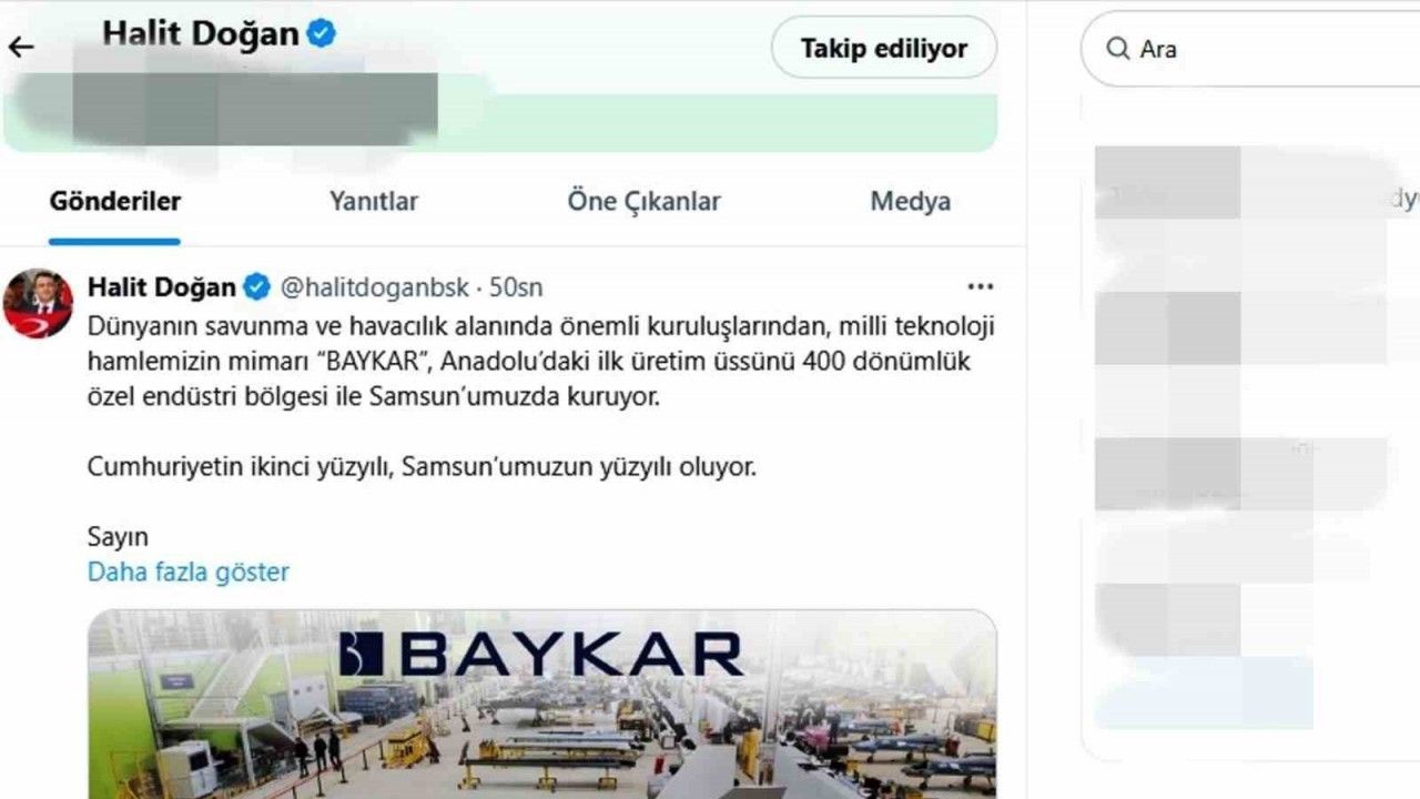Milli teknoloji hamlesinin mimarı BAYKAR’ın Samsun’daki yatırımı hakkında bilgi veren Başkan Doğan, "Dünyanın savunma ve havacılık alanında önemli kuruluşlarından, milli teknoloji hamlemizin mimarı ’BAYKAR’, Anadolu’daki ilk üretim üssünü 400 dönümlük özel endüstri bölgesi ile Samsun’umuzda kuruyor. Cumhuriyetin ikinci yüzyılı Samsun’umuzun yüzyılı oluyor. Cumhurbaşkanımız Recep Tayyip Erdoğan’a, Sanayi ve Teknoloji Bakanımız Mehmet Fatih Kacır’a, Haluk Bayraktar’a ve Selçuk Bayraktar’a, TBMM Plan ve Bütçe Komisyonu Başkanımız, Samsun Milletvekilimiz Mehmet Muş’a ve emeği olan herkese şükranlarımı sunuyorum. Ülkemize ve gazi şehir Samsun’umuza hayırlı olsun" dedi.