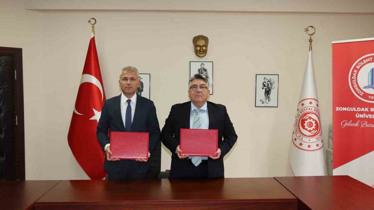 Ereğli Kömür Havzası Amelebirliği Biriktirme ve Yardımlaşma Sandığı Başkanlığında düzenlenen protokol imza töreninde Zonguldak Bülent Ecevit Üniversitesi Rektörü Prof. Dr. İsmail Hakkı Özölçer ile Amelebirliği Başkanı Veli Köktürk yer aldı.