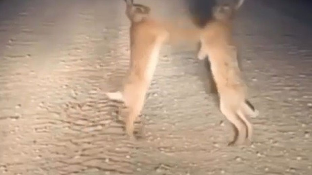 Bayburt’un Aydıntepe ilçesinde iki yaban tavşanı yol ortasında kavga ederken görüntülendi. Boks maçını aratmayan o anlar, yoldan geçen bir sürücü tarafından cep telefonu kamerasıyla kaydedildi.