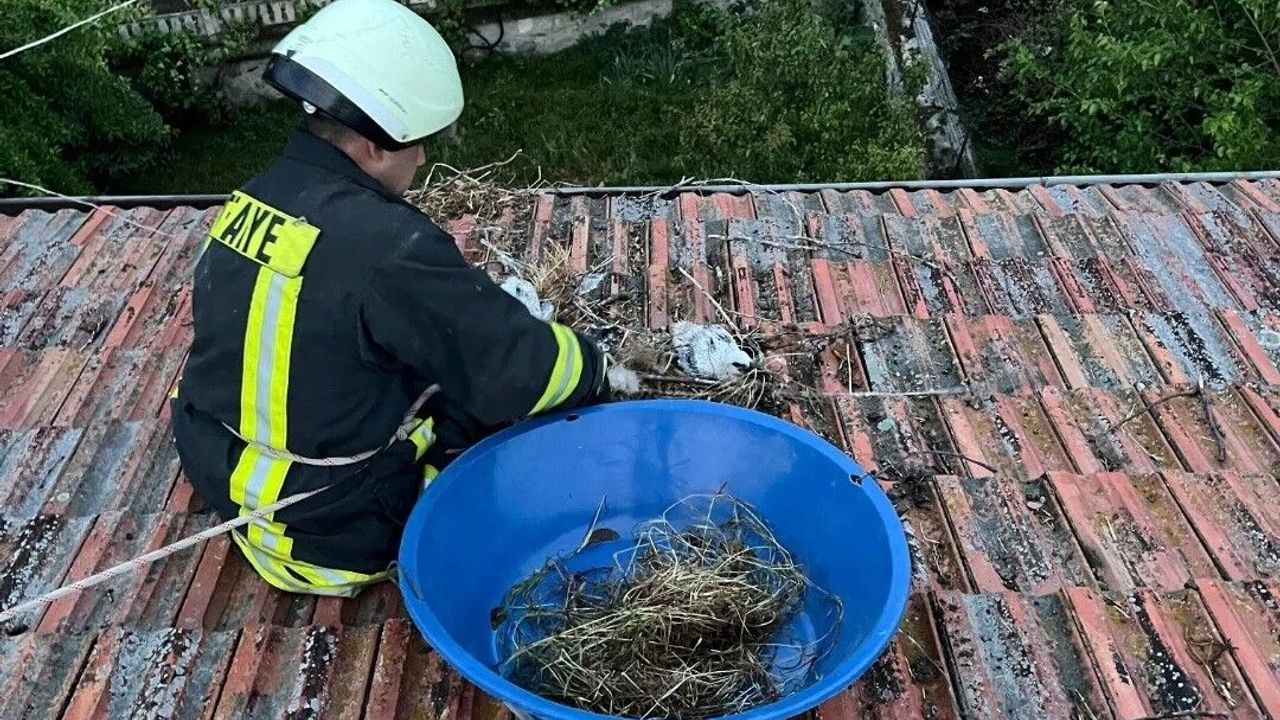 Kastamonu’nun Tosya ilçesinde fırtına sebebiyle yuvalarıyla birlikte çatının üzerine düşen ve mahsur kalan yavru leylekler itfaiye ekiplerinin çalışmasıyla güvenli alana taşındı.