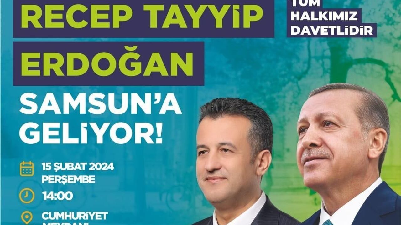 Cumhurbaşkanı Recep Tayyip Erdoğan, 15 Şubat Perşembe günü Samsun’da ’Büyük Samsun Mitingi’nde vatandaşlara hitap edecek. AK Parti Samsun Büyükşehir Belediye Başkan Adayı Halit Doğan, saat 14.00’te Cumhuriyet Meydanı’nda gerçekleşen olan mitinge tüm vatandaşları davet etti. Doğan, “Samsun’umuz, Cumhurbaşkanımıza olan sevgisini ve bağlılığını her zaman göstermiştir. Tüm hemşerilerimizi AK Parti Genel Başkanımız ve Cumhurbaşkanımız Sayın Recep Tayyip Erdoğan’ın Büyük Samsun Mitingi’ne davet ediyorum” diye konuştu.