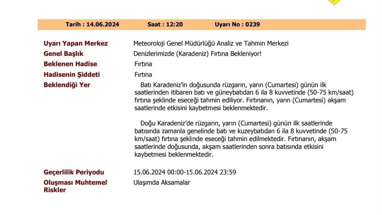 Meteoroloji 10. Bölge Müdürlüğü, Doğu ve Batı Karadeniz’de 15 Haziran Cumartesi kuvvetli rüzgar ve fırtına beklendiğini açıkladı. Açıklamada, "Batı Karadeniz’in doğusunda rüzgarın, 15 Haziran Cumartesi gününün ilk saatlerinden itibaren batı ve güneybatıdan 6 ila 8 kuvvetinde (saatte 50-75 km) fırtına şeklinde eseceği tahmin ediliyor. Fırtınanın aynı gün akşam saatlerinde etkisini kaybetmesi bekleniyor. Doğu Karadeniz’de ise rüzgarın, 15 Haziran Cumartesi günün ilk saatlerinde batısında zamanla genelinde batı ve kuzeybatıdan 6 ila 8 kuvvetinde (saatte 50-75) fırtına şeklinde eseceği tahmin edilmektedir. Fırtınanın, akşam saatlerinde doğusunda, akşam saatlerinden sonra batısında etkisini kaybetmesi beklenmektedir" denildi.