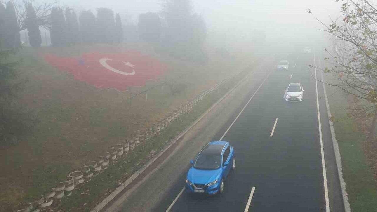 Düzce’de sabah saatlerinde sis nedeniyle görüş mesafesi 20 metreye kadar düştü. Araçlar ilerlemekte zorlandı.