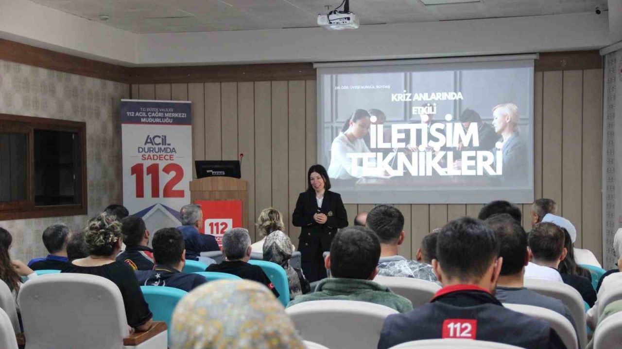 DÜZCE (İHA) – Düzce’de 112 Acil Çağrı Merkezi Müdürlüğünce Düzce Üniversitesi ve Yeşilay Danışmanlık Merkezi işbirliği ile etkili iletişim teknikleri konuşuldu.