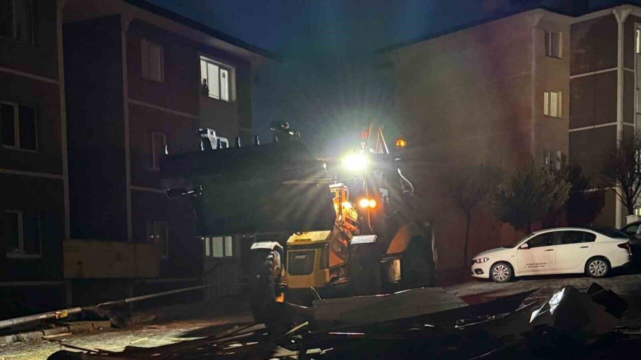 Bayburt’ta etkili olan kuvvetli fırtına nedeniyle bazı evlerin çatıları uçarak, etrafa saçılmıştı. Yola savrulan çatı sacları, belediye ekiplerince toplandı.