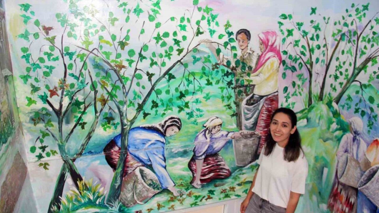 Giresun’un Piraziz ilçesinde fındık kırma atölyesi işleten Demet Öztürk, evinin merdiven duvarlarını bir sanat galerisine dönüştürdü. Öztürk, fındığın dört mevsim süren on iki aylık gelişim sürecini yağlı boya resimlerle anlattı.