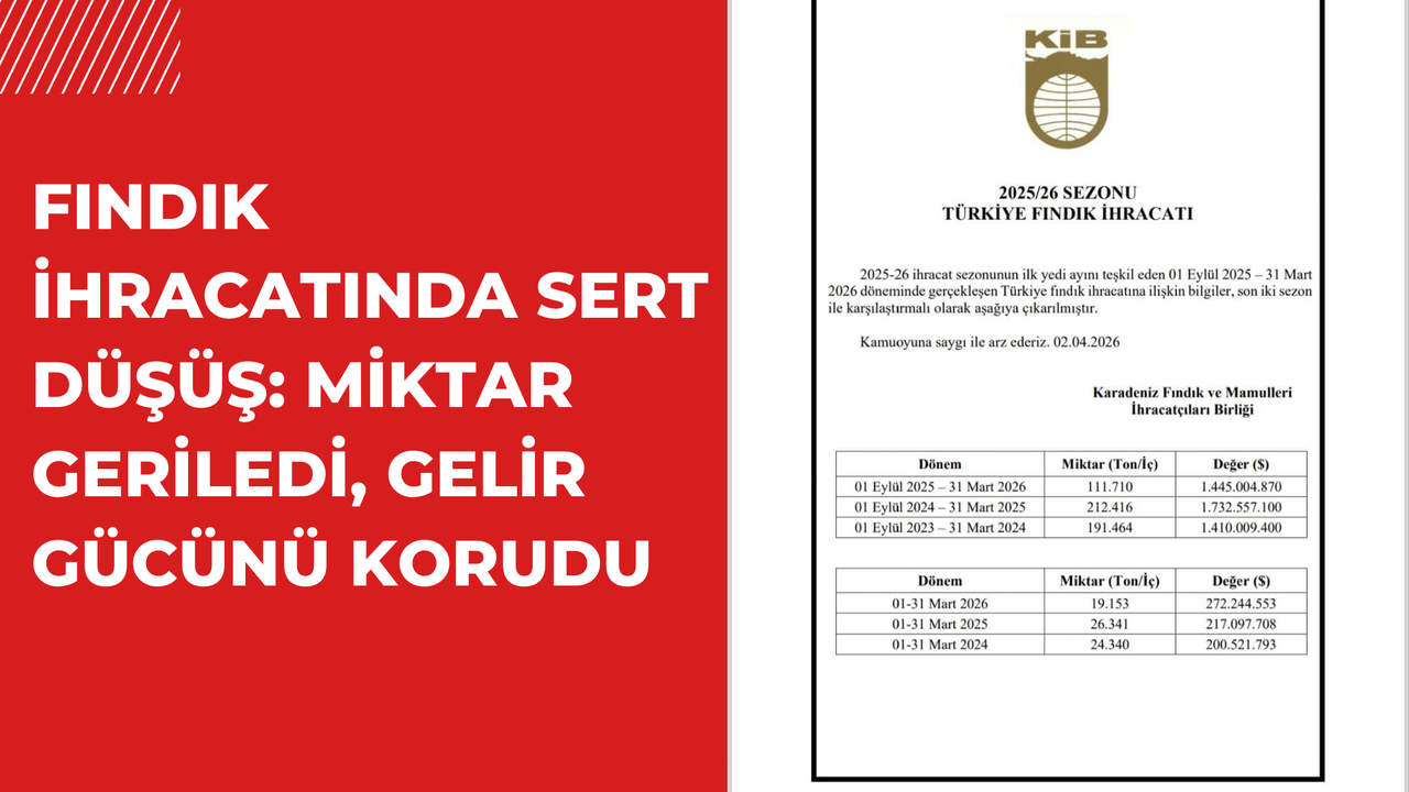 Türkiye’nin önemli tarımsal ihraç ürünlerinden fındıkta, 2025/26 sezonunun ilk 7 ayına ilişkin veriler ihracatta dikkat çekici bir daralmaya işaret etti. Karadeniz Fındık ve Mamulleri İhracatçıları Birliği verilerine göre, ihracat miktarı ciddi oranda gerilerken, elde edilen gelirdeki düşüş daha sınırlı kaldı.