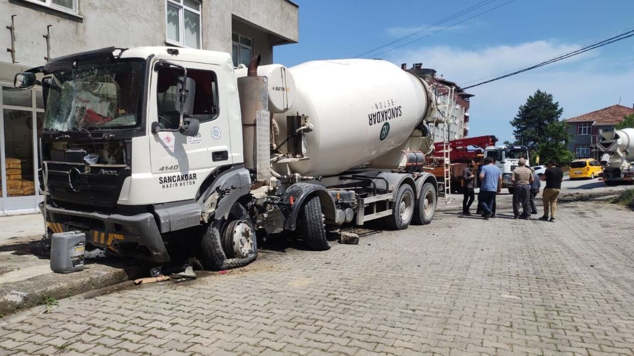 Kemal Yılmaz idaresindeki 37 ABV 548 plakalı beton mikserinin ilçe merkezinde yokuştan indiği sırada freni patladı.