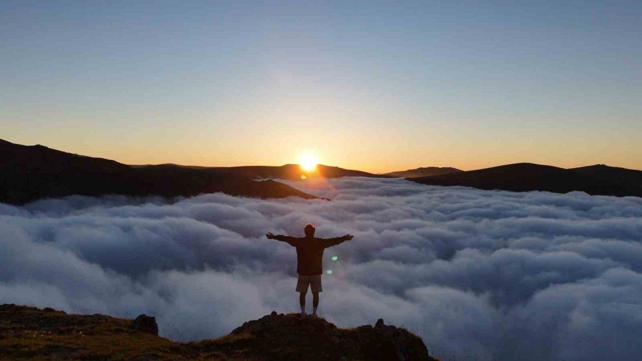 Gümüşhane’nin Karadeniz’e yakın zirvelerinde akşam saatlerinde oluşan sis denizi gün batımında turuncu ve mor tonlara bürünerek kartpostallık görüntüler oluşturdu.