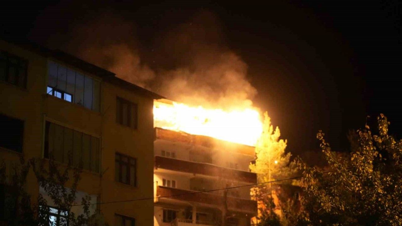 Gümüşhane’de 4 katlı bir binanın 3. katında çıkan yangında alevler geceyi aydınlatırken, evin boş olması faciayı önledi.