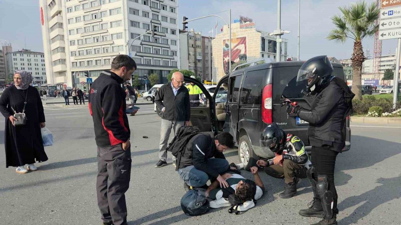 Çarpmanın şiddetiyle motosiklet sürücüsü yola savrularak yaralandı. Olay yerine sevk edilen polis ekipleri çevrede güvenlik önlemi aldı. Yaralı motosiklet sürücüsü, sağlık ekiplerince ambulansla hastaneye kaldırıldı. Yüzünde cam kırığı yaraları bulunan araç sürücüsü Y.Y. ise tedaviyi kabul etmedi.