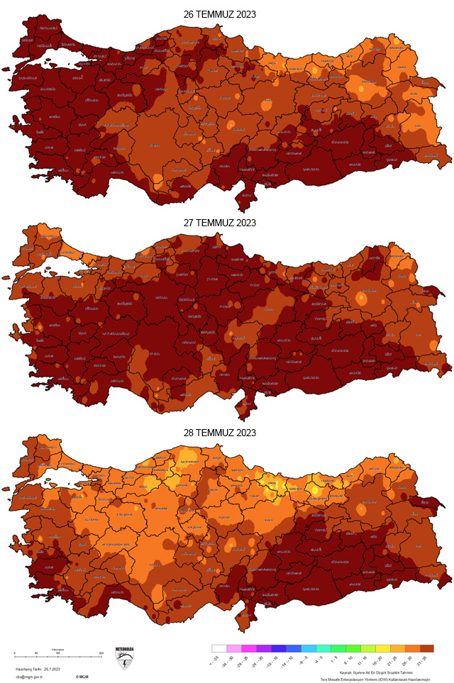 Üç günlük süreçte günün en yüksek sıcaklık değerleri Meteoroloji'nin haritalarına da yansıdı. Haritadaki en koyu bölgeler, 35 derece ve üzerini işaret ediyor.