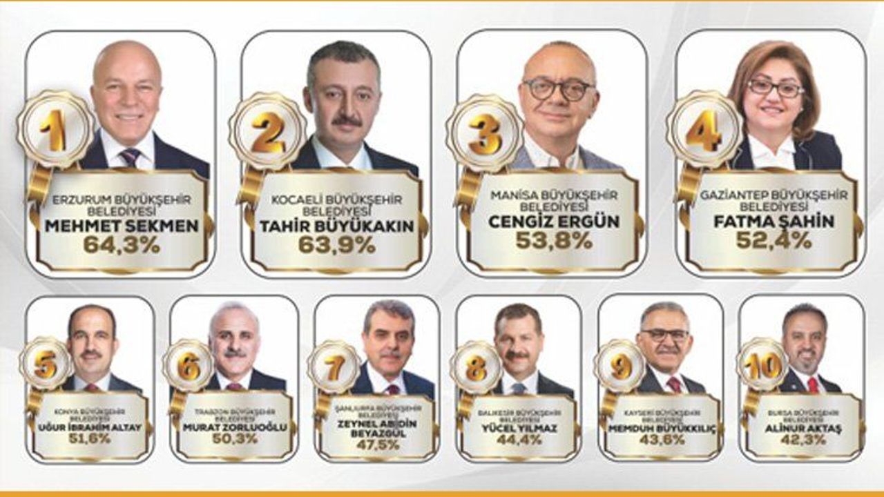 Gaziantep Büyükşehir Belediye Başkanı Fatma Şahin yüzde 52,4 dördüncü, Konya Büyükşehir Belediye Başkanı Uğur İbrahim Altay yüzde 51,6 ile beşinci, Trabzon Büyükşehir Belediye Başkanı Murat Zorluoğlu yüzde 50,3 ile altıncı, Şanlıurfa Büyükşehir Belediye Başkanı Zeynel Abidin Beyazgül yüzde 47,5 ile yedinci, Balıkesir Büyükşehir Belediye Başkanı Yücel Yılmaz yüzde 44,4 ile sekizinci, Kayseri Büyükşehir Belediye Başkanı Memduh Büyükkılıç yüzde 43,6 ile dokuzuncu, Bursa Büyükşehir Belediye Başkanı Alinur Aktaş yüzde 42,3 ile onuncu oldu.