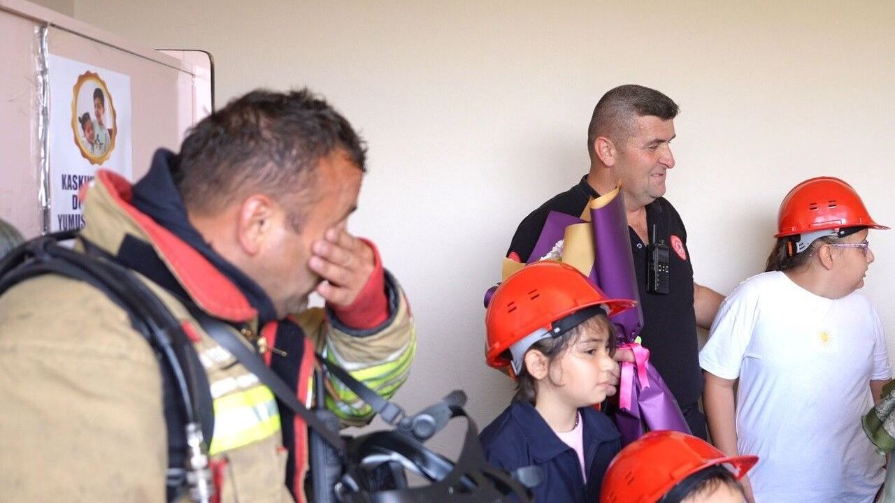 Bazı notlarda yer alan "Pelerinin olmasa da kaskın yeter" notları duygulandırdı. Sürpriz bununla da sınırlı kalmadı. Minik itfaiyeci kıyafetleri giyen çocuklar, ellerinde çiçeklerle babalarının yanına geldi. Babalar ve çocukların buluşması duygu dolu anlara sahne oldu.
