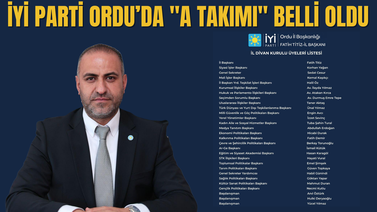 İYİ Parti Ordu İl Teşkilatı’nda yeni dönem görev dağılımı netleşti. İl Başkanı Fatih Titiz, oluşturulan yeni İl Divan Kurulu listesini açıklayarak, görev alan isimlere başarılar diledi. Titiz, güçlü bir kadro ile yola çıktıklarını vurguladı.