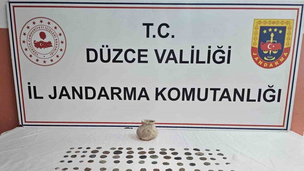 Düzce’de jandarma ekipleri, Topçular mahallesinde bulunan bir eve operasyon düzenledi. Yapılan aramada şahsın evinde Kültür ve Tabiat Varlıkları Kanunu’na tabi olduğu değerlendirilen; 107 adet sikke, 6 adet yüzük, 1 adet heykel, 18 adet obje, 1 adet toprak çömlek ele geçirildi.