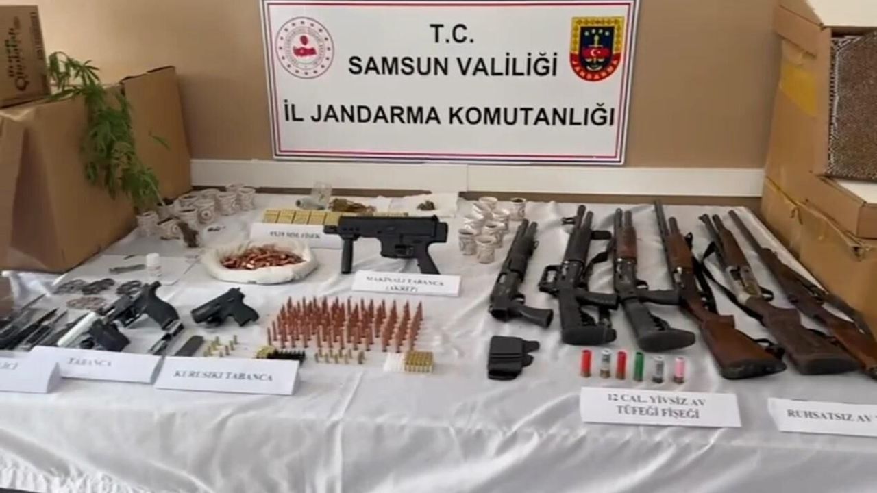 Edinilen bilgiye göre, Samsun İl Jandarma Komutanlığı İstihbarat Şube Müdürlüğü, Kaçakçılık ve Organize Suçlarla Mücadele (KOM) Şube Müdürlüğü, Ayvacık İlçe Jandarma Komutanlığı ve Jandarma Suç Araştırma Timi (JASAT) ekiplerinin ortak operasyonu neticesinde, Samsun’un Ayvacık ilçesi merkezli, ’suça iştirak için bir araya gelerek tehdit, darp, cebir kullanmak, kişiyi hürriyetinden yoksun bırakmak, kişiyi suç üstlenmeye zorlamak’ fiillerini işlediği tespit edilen şahısların yakalanmasına yönelik Ayvacık ve Çarşamba ilçelerinde eş zamanlı operasyon düzenlendi. Çok sayıda ikamet, işyeri ve araçlarda yapılan aramalarda toplam, bir evin tavan arasında aralarında akrep diye adlandırılan vahim nitelikli makineli tabancanın da bulunduğu çok sayıda silah ele geçirildi. Operasyonda yapılan aramalarda 1 adet akrep adlı makineli tabanca, 1 adet tabanca, 2 adet kurusıkı tabanca, 6 adet av tüfeği, 245 adet piyade tüfeği fişeği, 18 adet 7.65 mm fişek, 917 adet 9 mm fişek, 6 adet av tüfeği fişeği, 11 adet çeşitli tipte bıçak ve muşta, 291 bin 940 dal tütün dolu makaron, 2 kök kenevir bitkisi, 10 gram esrar ve 38 adet sentetik ecza hap ele geçirildi.