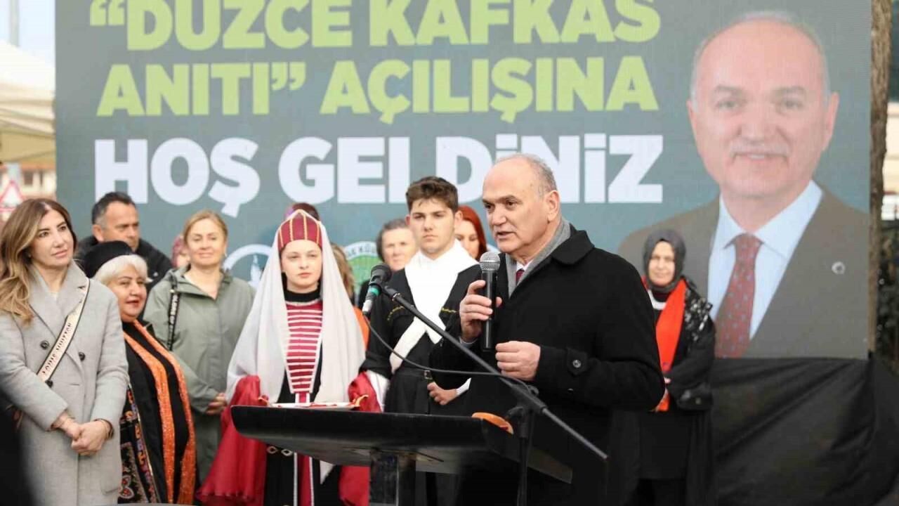 Kafkas Anıtı inşasının süreci hakkında bilgiler veren Başkan Faruk Özlü, Düzce’nin birçok etnik kökenin bir arada barış içinde yaşadığını belirterek “Bu anıtın yapımında katkısı olan çok değerli kardeşim Nejat bey burada. Beraber çalıştık toplantılar yaptık. Bu fikir Çerkes ve Abhaz büyükleri arasında kabul gördü. Samsun 19 Mayıs Üniversitesi’nden Güngör hocamız bu anıtın tasarımını yaptı ve yapımını üstlendi ekibi ile birlikte. Ben son derece mutluyum. 3 yıl önce düşündüğümüz bir fikir hayata geçti. Sürgün konusu büyük bir dramdır. Maalesef biz mesela böyle acıların romanlarını yazamadık, filmlerini yapamadık. Tarihimiz çok zengin, bunlardan bir eser çıkaramadık. Ben buradan seslenmek istiyorum edebiyatçı dostlarımıza bu acıların romanlarını yazalım, filmlerini yapalım, gelecek nesillere aktaralım. Bunu neden yaptığımızı söyleyeyim; Anadolu bizim ana vatanımız Kafkaslarda güvenlik yoksa Balkanlarda sorun varsa biz burada yaşayamayız. Gençlerimizin bu anıtlara bakıp geçmişi hatırlaması ve aidiyet duygumuzun kopmaması için bu lazım. Sürgünün yıl dönümüne denk gelen bu açılış vesilesi ile anma programları ve seminerlerinizi burada yapmanızı dilerim, ben de gelirim. Kalıcı bir eser kazandırmış olalım inşallah. Düzce’de hiçbir etnik çatışma yaşanmamıştır. Bu açıdan Türkiye’ye örnek bir şehirde yaşıyoruz.”