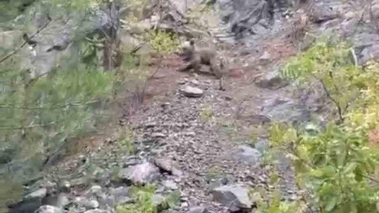 Karabük-Yenice karayolu tüneller mevkisinde seyir halinde olan bir sürücü, kayalık yamaca tırmanan yavru ayıyı fark etti. Yağmura aldırış etmeyen sürücü, aracının camını açarak cep telefonuyla ayıyı kayda aldı. Sürücünün "gel" diye seslendiği yavru ayı kısa süre sonra ağaçlık alana girerek gözden kayboldu.