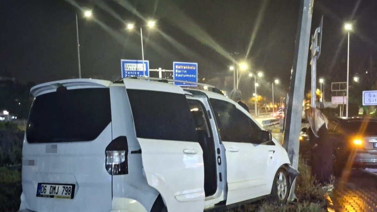 Öğlebeli Kavşağı’nda meydana gelen kazada O.İ. idaresindeki 06 DMJ 798 plakalı hafif ticari araç, sürücüsünün kontrolünden çıkarak refüjdeki aydınlatma direğine çarptı.