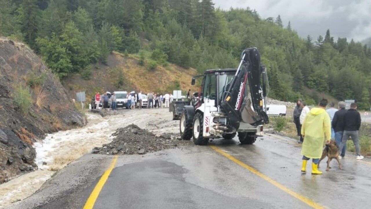 Kastamonu’nun Küre ilçesinde etkili olan kuvvetli sağanak yağış sebebiyle kapanan yol, ekiplerin çalışmasıyla ulaşıma açıldı.