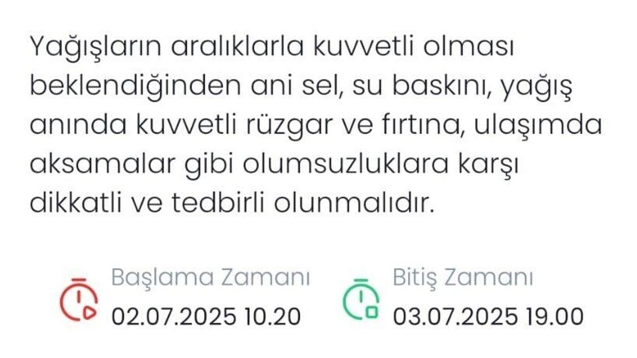 Meteoroloji Genel Müdürlüğünden yapılan uyarıda, 2 Temmuz öğlen saatlerinden itibaren etkili olacak yağışların, bir sonraki günün akşam saatlerine kadar etkili olacağı bildirildi. Aşırı yağışlara karşı dikkatli olunması gerektiğine dikkat çekilen uyarıda, "Yağışların aralıklarla kuvvetli olması beklendiğinden ani sel, su baskını, yağış anında kuvvetli rüzgar ve fırtına, ulaşımda aksamalar gibi olumsuzluklara karşı dikkatli ve tedbirli olunmalıdır" denildi.