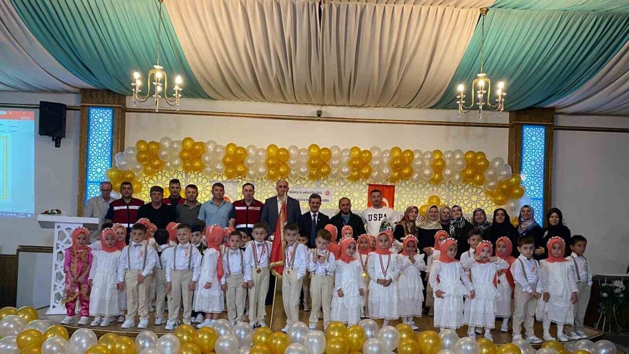 Düzce’de minik öğrencilerin katılım sağladığı Kur’an Kurslarının yıl sonu kapanış etkinlikleri devam ediyor. Bu çerçevede Beyköy Değirmenbaşı’nda bulunan 4-6 yaş Kur’an kursunun kapanış programı ailelerin ve protokol üyelerinin katılımı ile gerçekleştirildi. Kur’an-ı Kerim tilaveti ile başlayan kapanış programında kursta öğrenim gören minik öğrencilerin sahne gösterileri dikkat çekti. Programa katılan Beyköy Belediye Başkanı Fatih Ocak, Beyköy Jandarma Komutanı Emrah Aktaş, İl Müftü Yardımcısı Selma Velioğlu Çelik, İl Müftüsü Osman Aydın, miniklerin başarılarını tebrik ederek çeşitli hediyeler verdi.