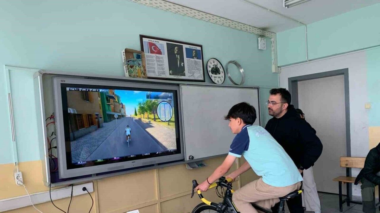Bolu’da ortaokul öğrencileri, bisiklet simülasyon sistemiyle hem eğlendi hem sporla tanıştı.