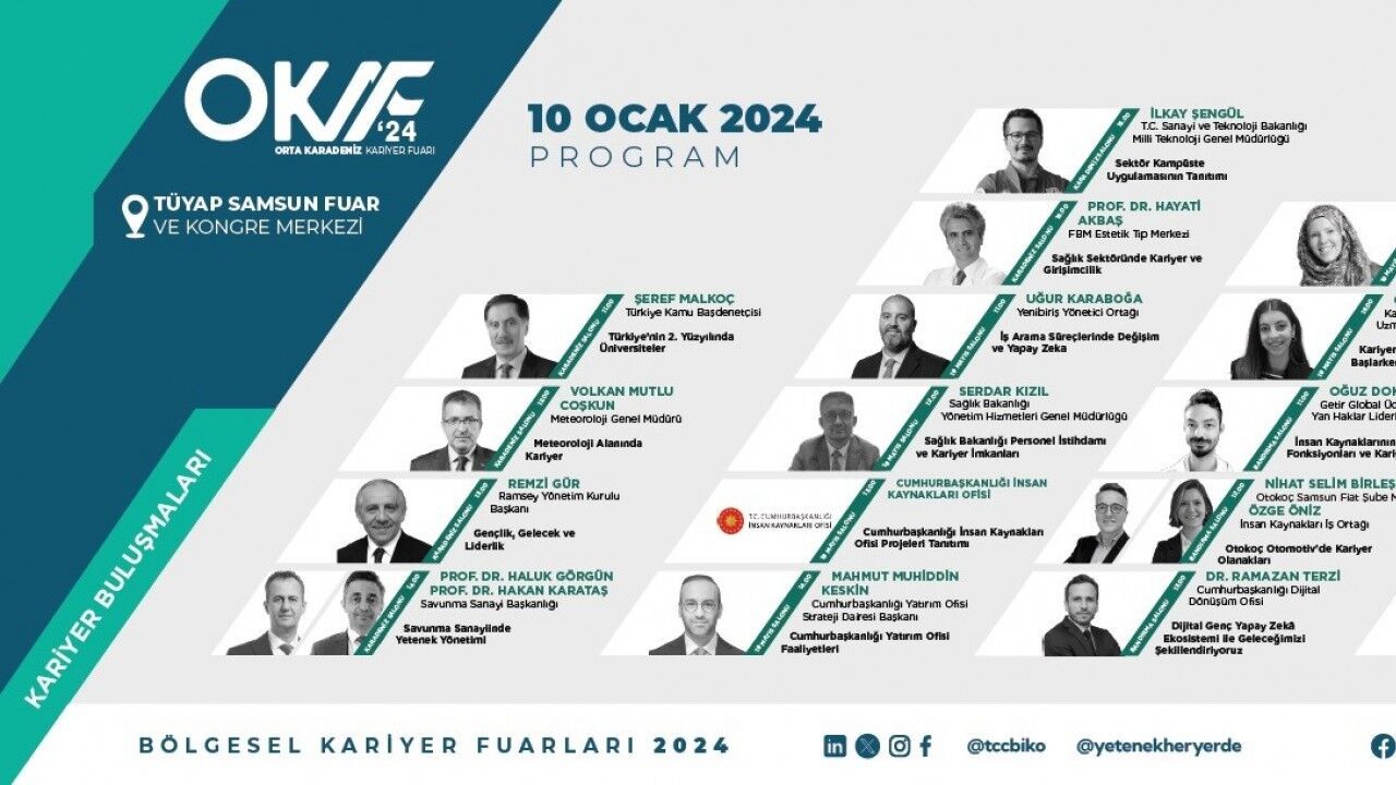 Cumhurbaşkanlığı İnsan Kaynakları Ofisi’nin koordinasyonunda organize edilen OKAF’24, 10-11 Ocak Samsun Fuar ve Kongre Merkezinde ziyaretçilerini ağırlayacak. "Yetenek Her Yerde" teması altında ve "100 Yıllık Mirası Geleceğe Taşı" mottosuyla düzenlenen fuarda Türkiye Kamu Başdenetçisi Şeref Malkoç ve Savunma Sanayii Başkanı Prof. Dr. Haluk Görgün’ün de katılarak bir konuşma yapması planlandı.