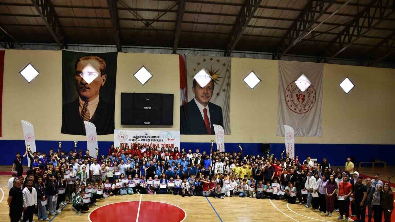 Samsun’un Vezirköprü ilçesinde 2024-2025 eğitim-öğretim yılı okul sporları kapsamında düzenlenen müsabakalarda dereceye giren öğrencilere yönelik ödül töreni gerçekleştirildi. Gençlik ve Spor İlçe Müdürlüğü Kapalı Spor Salonu’nda düzenlenen törende, farklı branşlarda yarışan 42 takımdan 452 öğrenci, elde ettikleri başarılar dolayısıyla madalya ve kupayla ödüllendirildi.