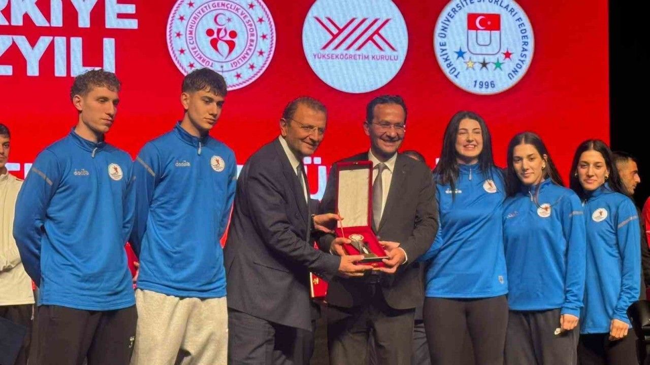 TÜSF Başkanı Prof. Dr. Mutlu Türkmen tarafından takdim edilen ödül, OMÜ Genel Sekreteri Erhan Burak Pancar ile Avrupa’da madalya kazanan sporcuların katılımıyla sahnede teslim alındı.