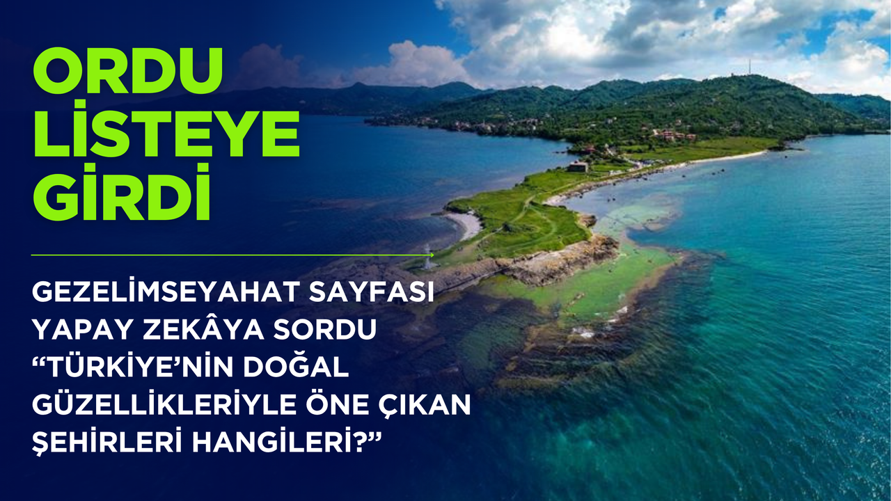 Popüler seyahat platformu GezelimseYahat, yapay zekâya “Türkiye’nin doğal güzellikleriyle öne çıkan şehirleri hangileri?” sorusunu yöneltti. Yapay zekânın oluşturduğu listede Ordu da yer aldı.