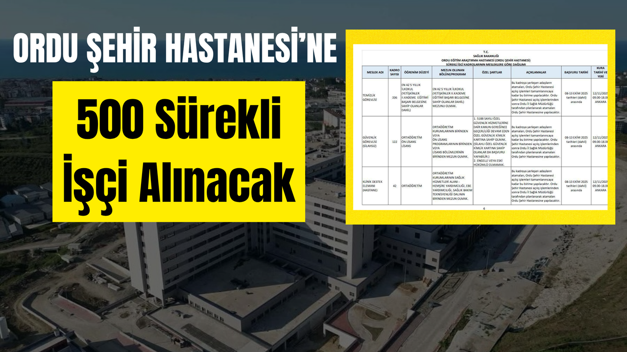 Sağlık Bakanlığı, 11 ilde toplam 2 bin 764 sürekli işçi alımı yapacağını duyurdu. Alımlar kapsamında Ordu Şehir Hastanesi’ne 500 kişilik kontenjan ayrıldı.