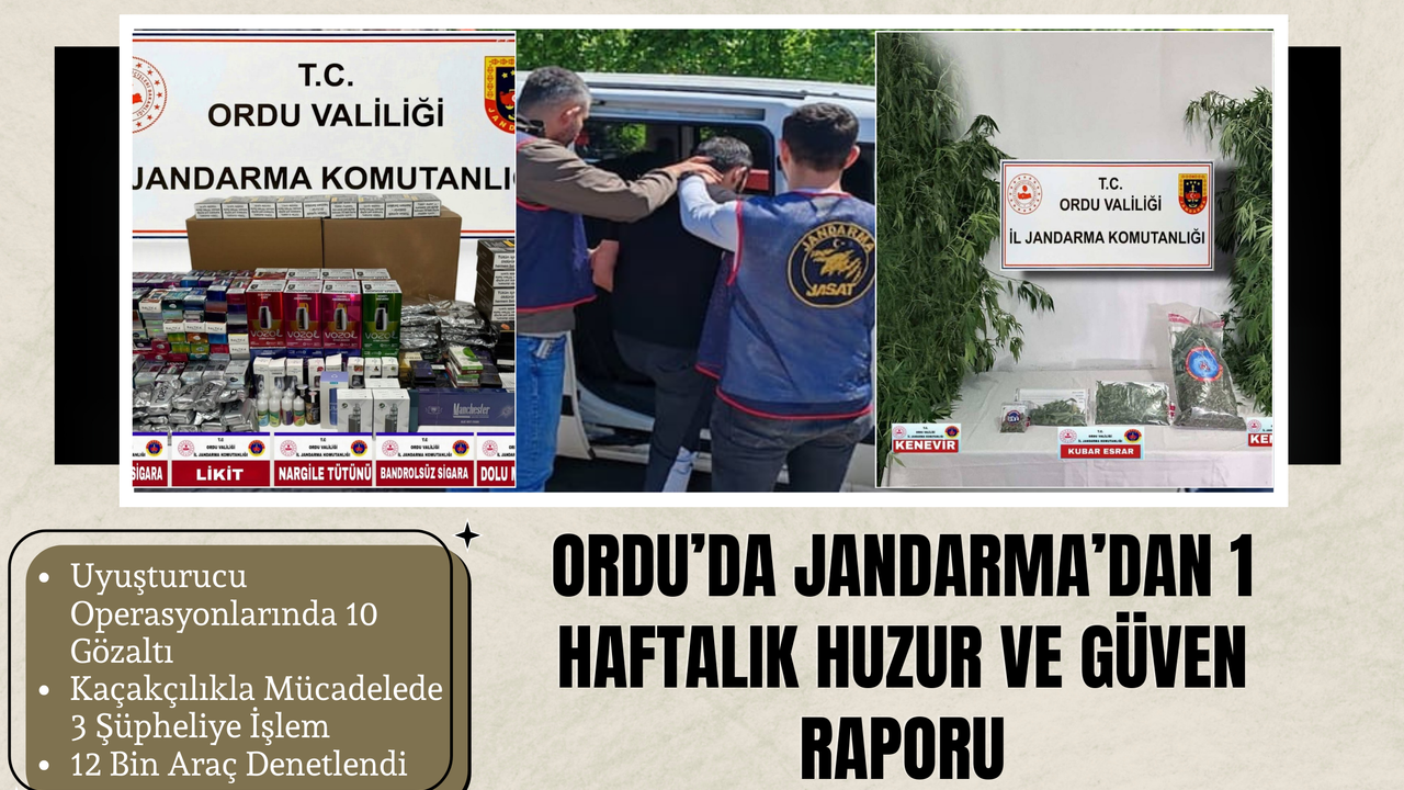 Ordu İl Jandarma Komutanlığı, 25-31 Ağustos 2025 tarihleri arasında yürüttüğü faaliyetlerle emniyet, asayiş ve kamu düzeninin sağlanmasına yönelik çalışmalarını paylaştı.