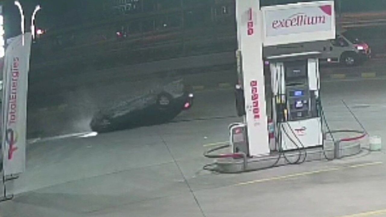 Karabük’te bir otomobilin akaryakıt istasyonuna girmeye çalıştığı sırada önce otomobile sonra kaldırıma çarparak ters döndüğü anlar güvenlik kamerasına yansıdı.